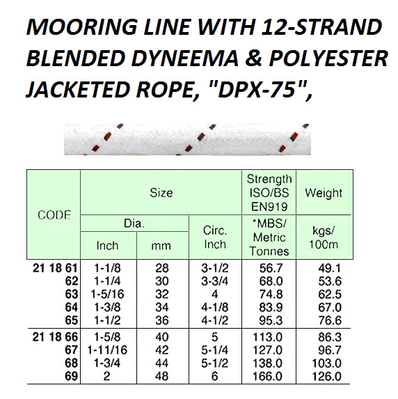 MOORING LINE WITH 12-STRAND, BLENDED DYNEEMA & POLYESTER JACKETED ROPE, "DPX-75", 200 MTR x 42 MM, BTL: 127 TON |